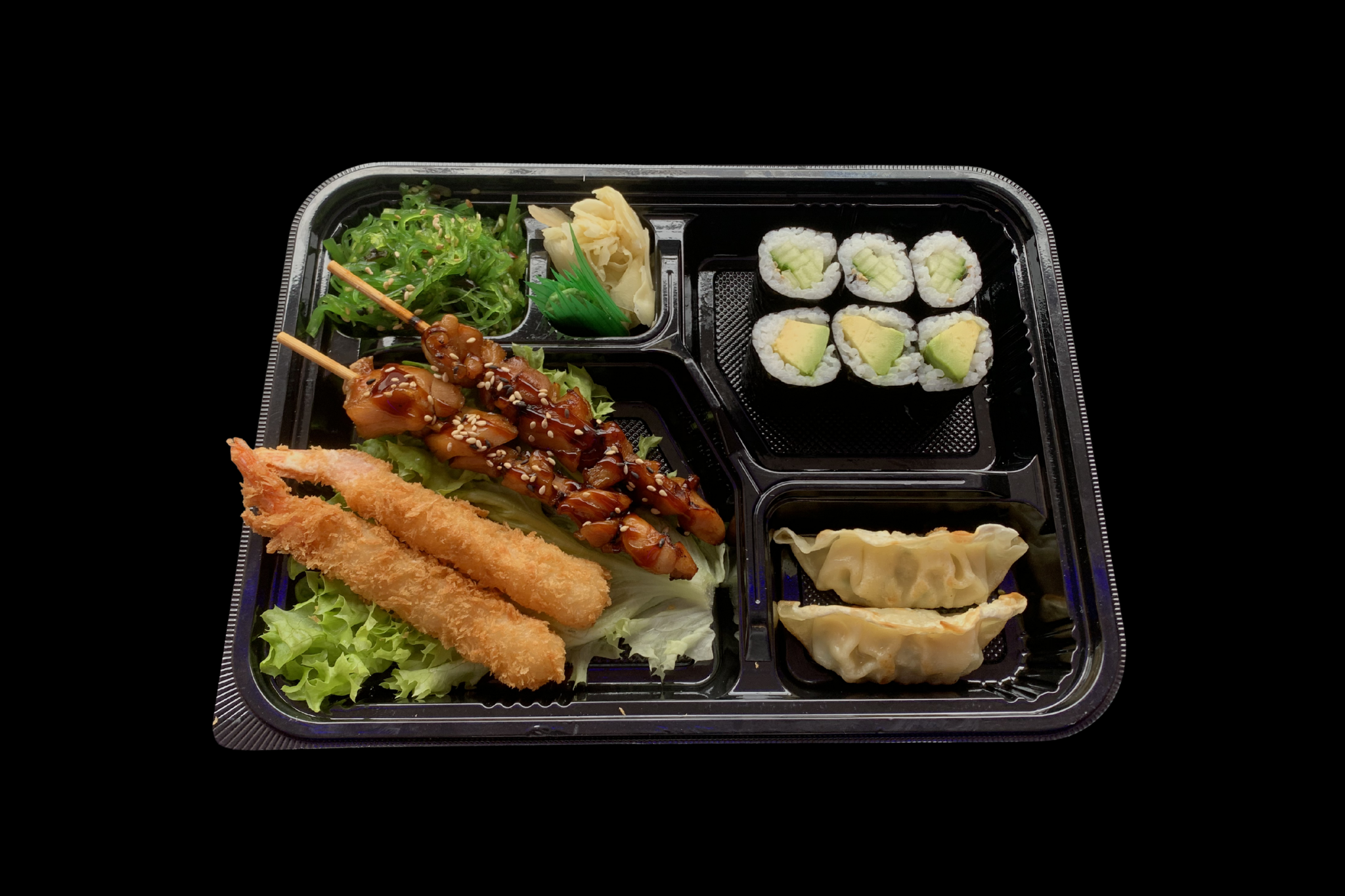 3x Avocado und Gurken Maki, 2x Yakitorispieße und panierte Garnelen, 2x Gyoza, Wakame