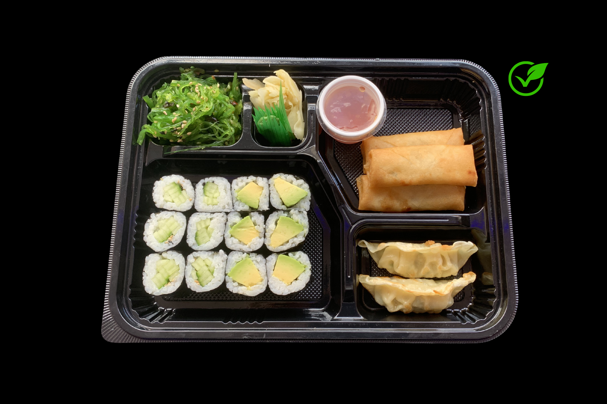 6x Avocado und Gurken Maki, 3x Frühlingsrollen, 2x Gyoza Veggie, Wakame