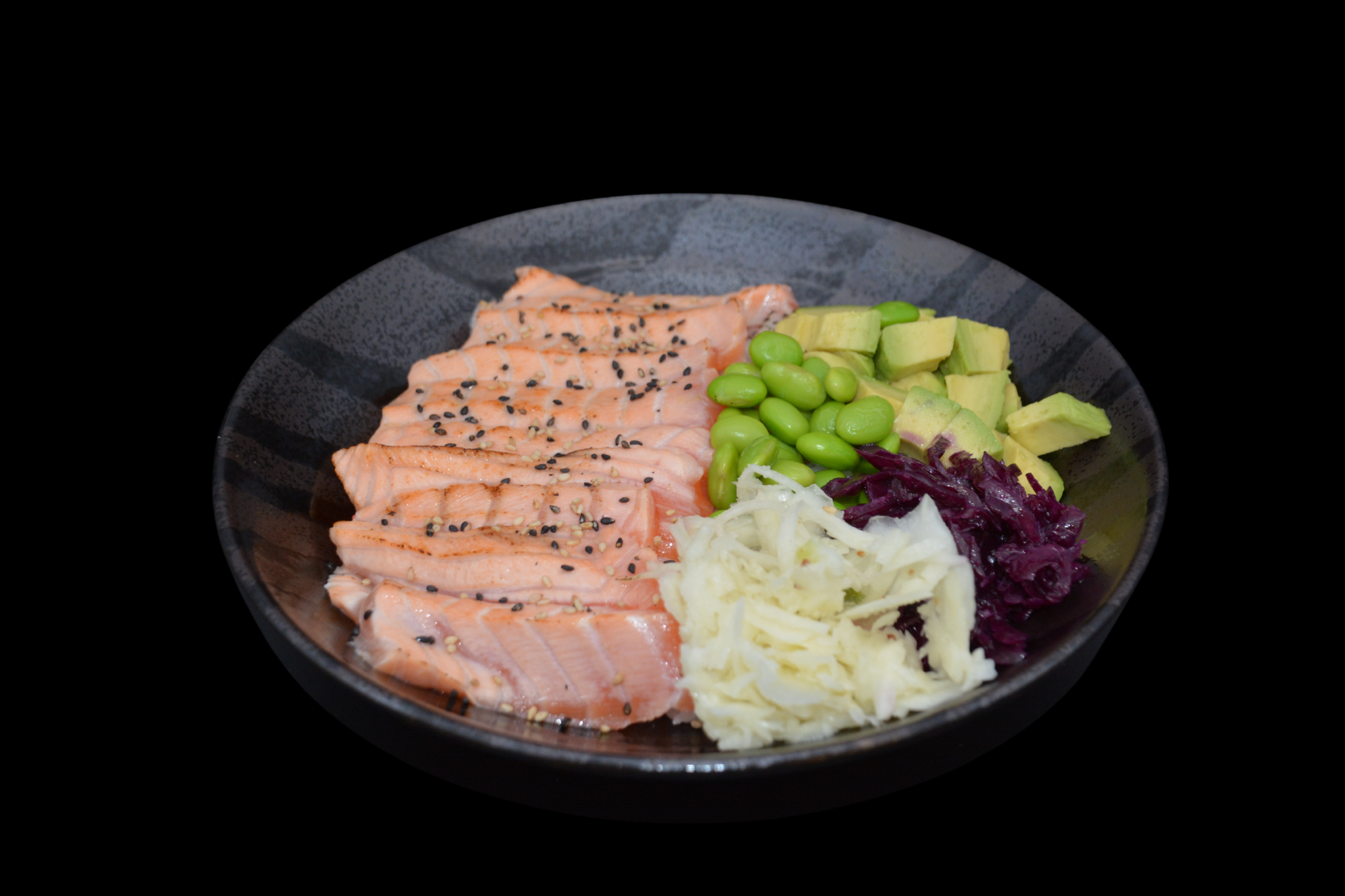 Flambierter Lachs, Avocado, Krautsalat, Rotkohlsalat, Edamame auf Reis mit Sesamsoße