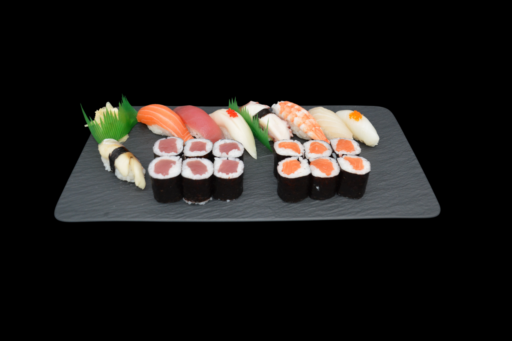 7x gemischte Nigiri, 6x Lachs Maki, 6x Thunfisch Maki