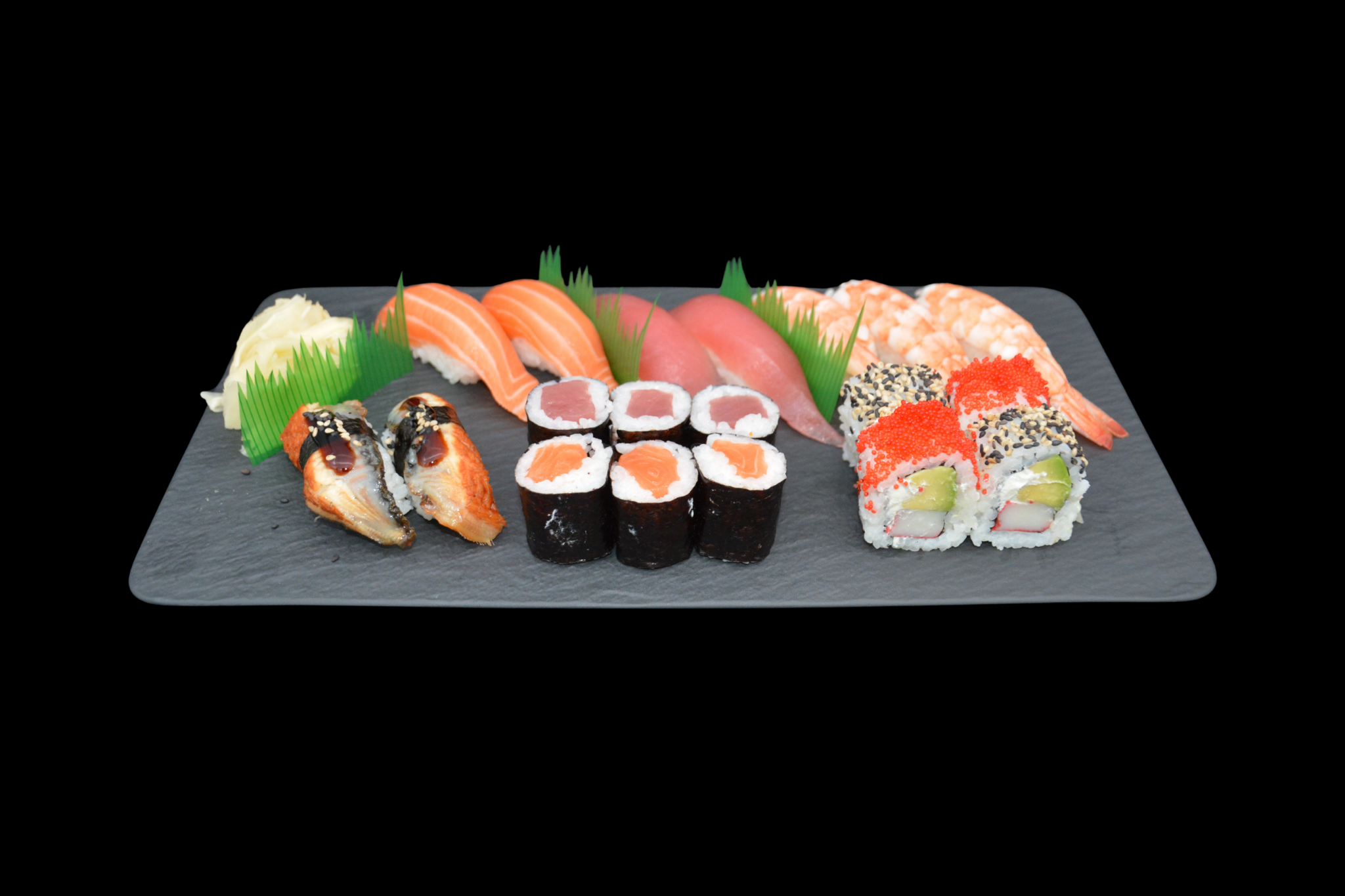 2x Lachs, Thunfisch, Ebi und Unagi Nigiri, 3x Lachs und Thunfisch Maki, 4 California Inside Out
