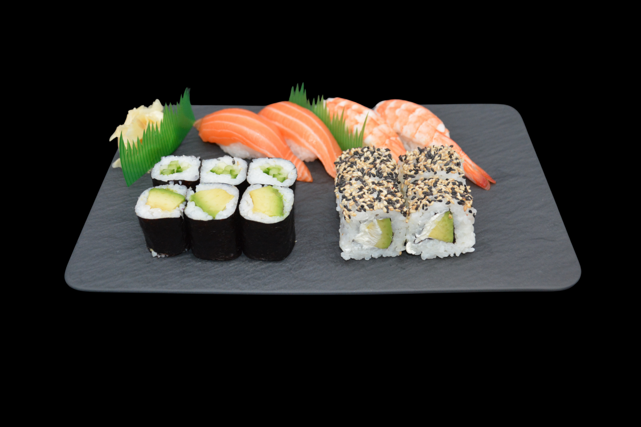 2x Lachs und Ebi Nigiri, 3x Avocado und Gurken Maki, 4x Philadelphia Inside Out